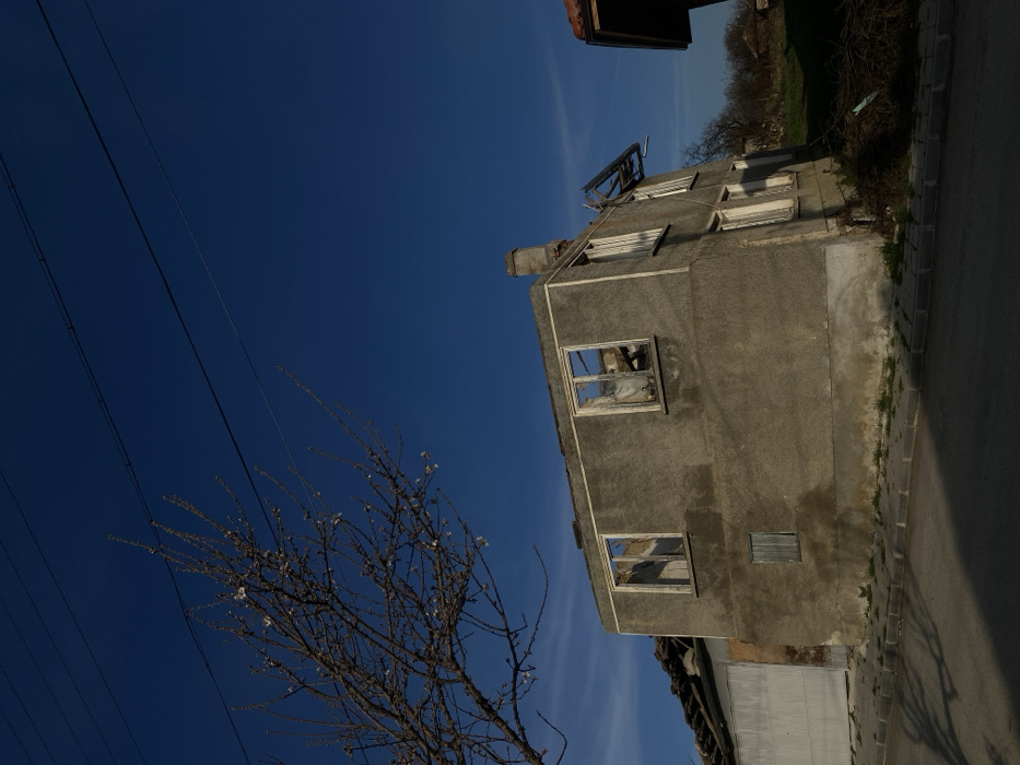 The image displays an abandoned two-story residential building with a grey stucco exterior under a clear blue sky in Dobri dial, Bulgaria. The front facade of the upper floor features two large, empty window frames with no glass, revealing internal damage. The lower floor includes a smaller, closed window with a wooden shutter and another open window frame without glass. The right side of the building also shows multiple empty window frames and a section of a roof structure or awning that appears collapsed and angled downwards. A brick chimney rises from the roofline. To the left, a one-story building with a light-colored metal garage door or gate adjoins the main structure, and its roof shows signs of damage. A paved road and concrete curb are in the immediate foreground, with shadows from a bare-branched tree in the upper left. Overhead power lines stretch across the sky. Piles of dry brush and debris are visible on the ground beside the right side of the main building. No individuals are present in the scene.