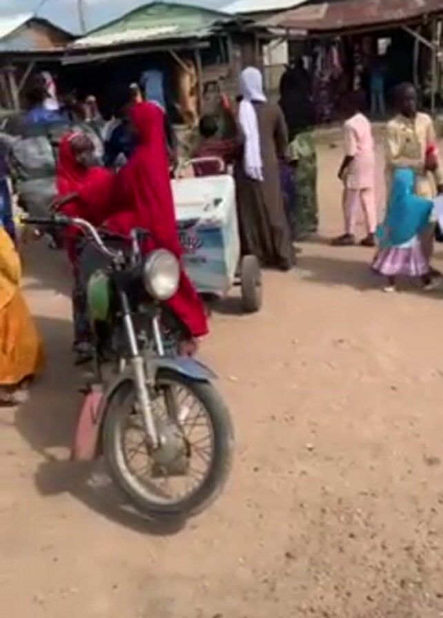 dusty road in what appears to be a small village. Several people dressed in various traditional or religious clothing are present. A motorcycle is parked on the left side of the frame, with a small, wheeled cart attached behind it. The cart appears to be a cooler or storage unit, possibly for selling items. Several small buildings, likely shops, are visible in the background, with goods hanging outside. The overall scene suggests a busy day in a rural setting.