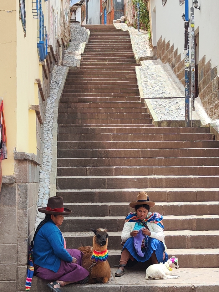 This image depicts a steep, ascending stone staircase in a historic urban area of Cuzco, Peru, flanked by buildings. In the foreground, on the bottom steps, two indigenous women are seated alongside a llama and a lamb. The woman on the left wears a dark brown fedora-style hat, a blue long-sleeved top, and a purple skirt, with a colorful patterned sash extending from her left side. She is positioned facing towards the right. The woman on the right wears a tan fedora-style hat, a white long-sleeved top, a colorful striped shawl, and a blue skirt. She is engaged in knitting with purple yarn. Between the two women, a light brown llama sits on the steps, adorned with a multi-colored, rainbow-patterned collar. To the right of the second woman, a small white lamb or goat kid lies on the stone steps, wearing a floral wreath around its head. The central feature of the scene is a long, wide staircase composed of numerous light brown stone steps, ascending steeply into the distance. On either side of the main staircase are narrower, sloping paths constructed from small, light-colored cobblestones. Buildings line both sides of the ascent; the one on the left is light yellow with a stone foundation and blue exterior fixtures, displaying a hanging textile. The building on the right is white with a stone foundation, featuring a blue utility pole covered in various stickers. The scene is brightly lit by daylight.