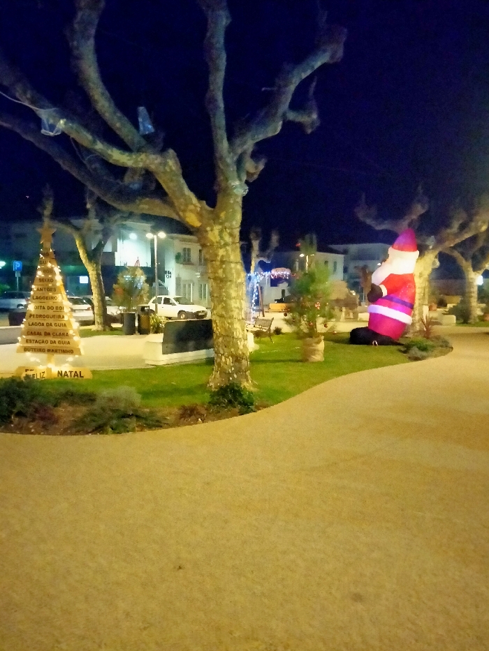 A nighttime scene depicts a town square decorated for Christmas. A white Christmas tree structure displays illuminated place names, with "Feliz Natal" at the base. A large inflatable Santa Claus stands on a patch of grass near a tree. Bare trees frame the scene under a dark blue sky. Buildings and streetlights are visible in the background, adding to the festive atmosphere. The foreground features a paved walkway, bathed in a warm, yellow light.