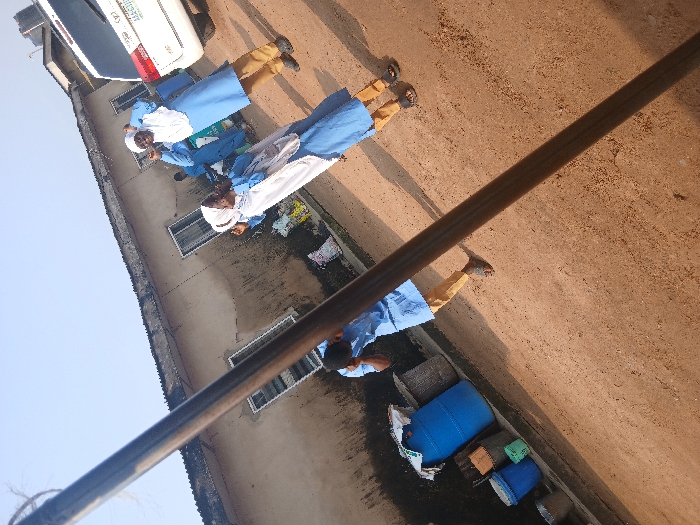 - "An outdoor scene in Idimu, Nigeria, depicts an unpaved, reddish-brown dirt ground with three individuals, likely young females, dressed in light blue tunics and tan trousers" by FM-WIbJ12, licensed under CC BY 4.0