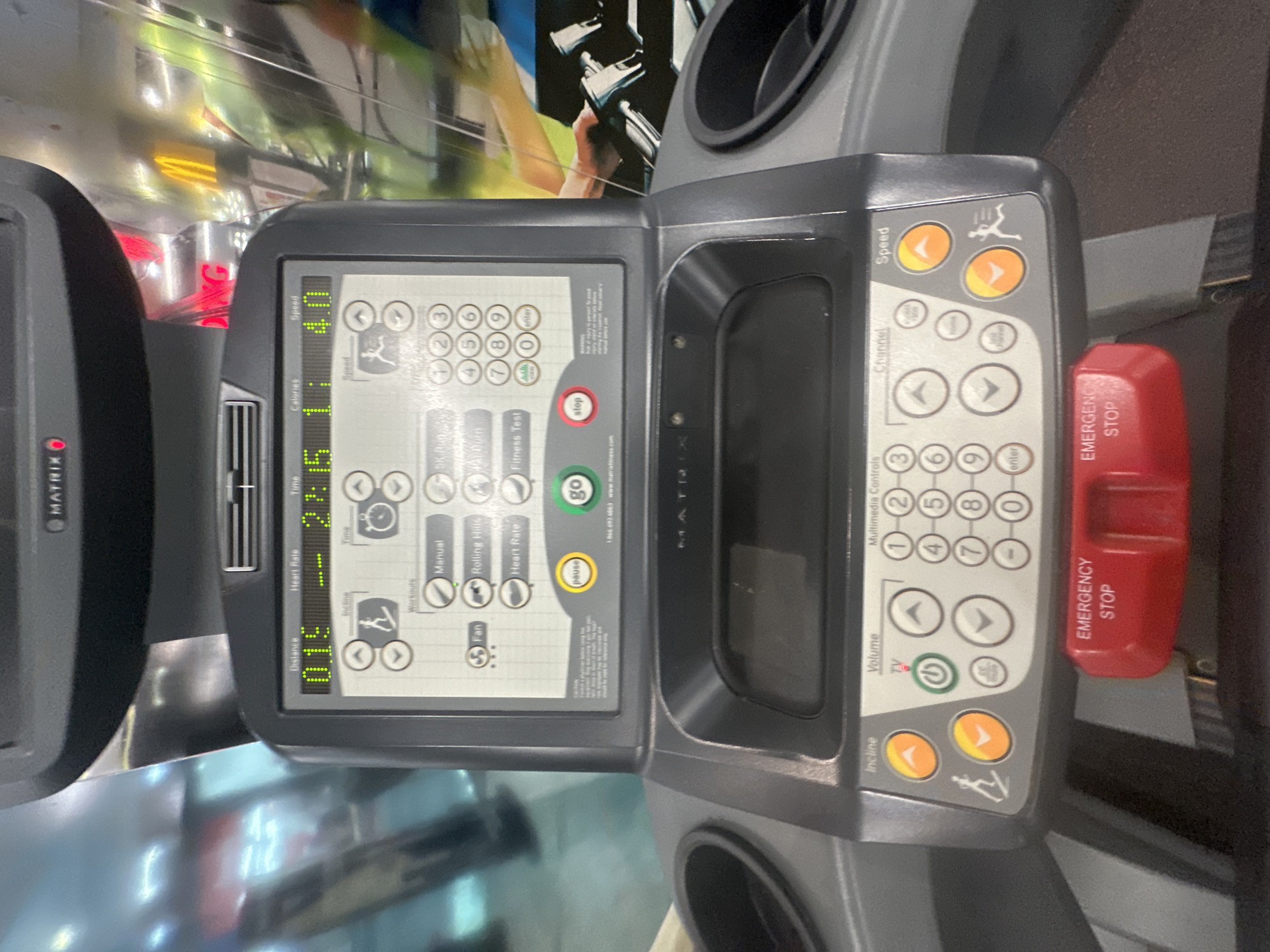 - "The image displays a close-up, slightly elevated perspective of a dark gray "MATRIX" brand treadmill console" by FM-Z09wC2, licensed under CC BY 4.0