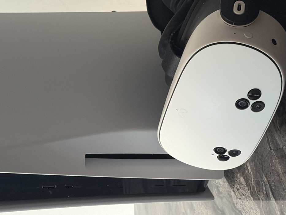 The scene is located in Saint-Étienne, France. The image displays two consumer electronic devices in an indoor setting. In the background, a white PlayStation 5 console stands vertically, its left side partially visible. The console exhibits a black central core with white outer plates, and a vertical cooling vent is apparent. Several dark input ports are visible along the console's left edge. In the foreground, a white Meta Quest 3 virtual reality headset rests on its side, angled towards the viewer. The headset's front faceplate, slightly off-white, features six black circular tracking cameras arranged in two triangular clusters of three. A subtle, embossed logo is centered on the top portion of the faceplate. A black adjustable strap system is partially visible behind the headset, and a USB-C charging port is present on its right side. Both devices are positioned on a dark, textured surface, possibly a stone or laminate tabletop. A plain, light-colored wall serves as the background. No individuals or active interactions are depicted.