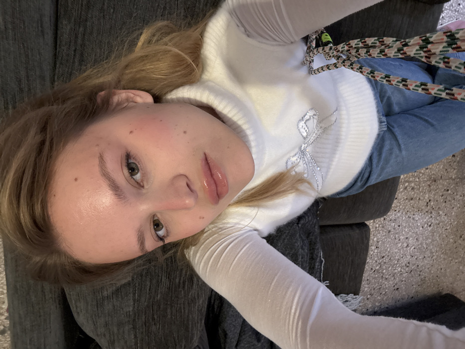 A high-angle photograph captures a young adult female looking directly into the camera. She possesses fair skin with visible freckles or moles, hazel eyes, and light brown hair. Her lips exhibit a glossy, light pink appearance. She is attired in a white, ribbed turtleneck sweater featuring sheer long sleeves and a prominent silver bow-like embellishment on the chest. Light blue denim jeans are visible from the waist down. A multicolored woven strap, appearing to be part of a bag, is visible to the right of her torso. The background consists of a dark gray upholstered surface, likely furniture, and a light-colored, speckled floor surface, consistent with terrazzo or tile, in the lower left portion of the frame. The scene is located in Anzio, Italy.