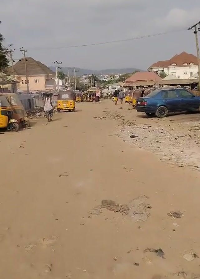 dirt road lined with buildings and vehicles in what appears to be a residential area