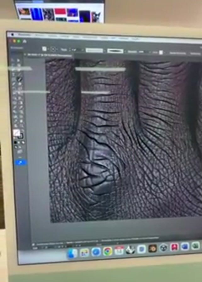 A close-up shot shows a computer screen displaying a detailed digital image of heavily wrinkled skin, possibly a human palm. The image is likely being edited or created in a design software, judging by the toolbars and interface visible on the sides of the screen. The wrinkles on the skin are very pronounced, creating a textured effect. Above the computer screen is a smaller TV screen showing various images. The setting appears to be an office or studio environment with a clean, minimalist aesthetic.