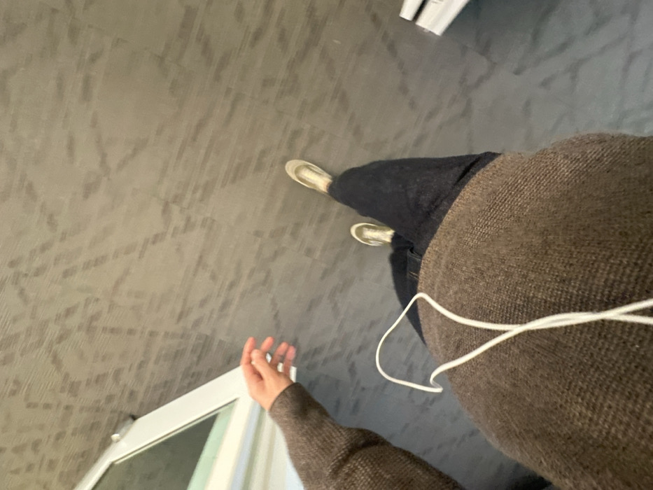 The image displays an individual's lower body and immediate surroundings indoors in Wellesley, United States, from a high-angle perspective. The person wears a brown, textured long-sleeved garment over dark blue pants, with light-colored flat shoes. A white earbud cable hangs down the front of the person's body. The floor is covered with a grey, patterned carpet or tile. A white door or window frame with light visible beyond it is present on the left side of the frame. A stack of white objects is partially visible on the floor to the bottom right.