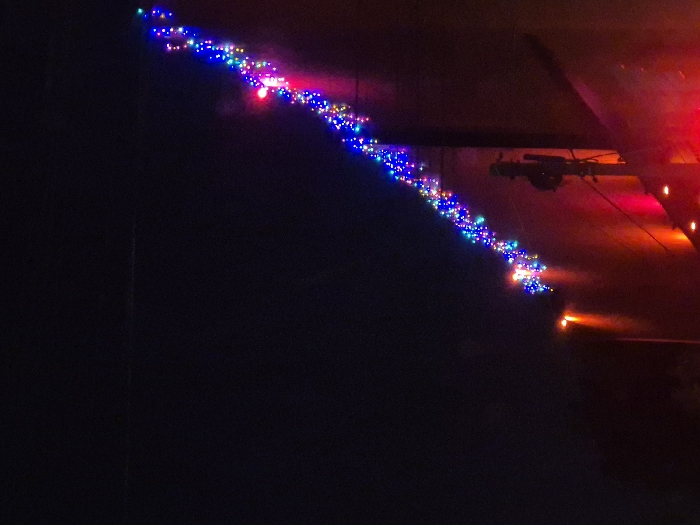A diagonal line of colorful string lights descends into a dark expanse. Above, a structure casts a shadow, with hints of mounted objects. Further right, red and orange hues emanate from lights attached to the structure. The darkness dominates, emphasizing the lit elements.