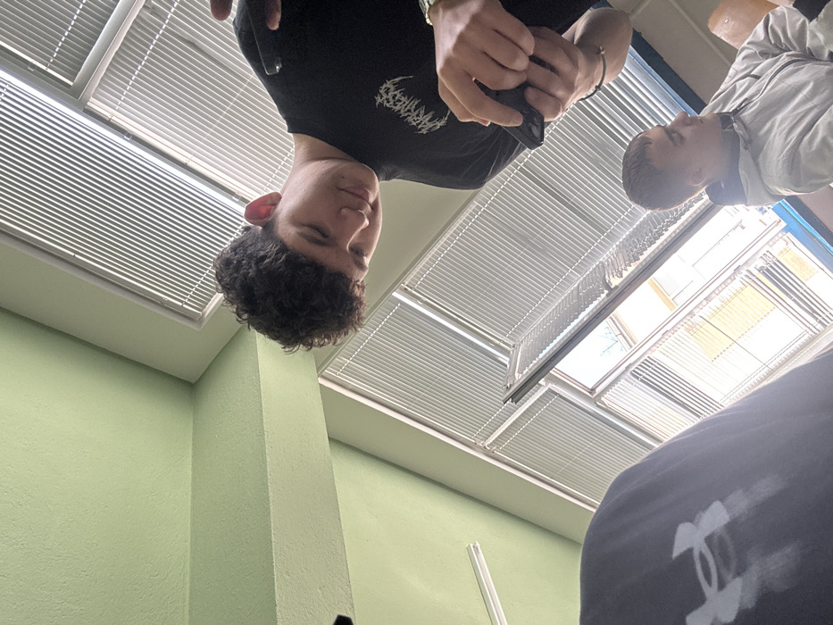 The image depicts an indoor scene within a room, located in Dimitrovgrad, Bulgaria, captured from a low-angle perspective. The room's ceiling and upper walls are painted light green, and a fluorescent light fixture is visible overhead. Multiple large windows, fitted with white horizontal venetian blinds, are present, allowing daylight to illuminate the space and revealing a view of an exterior building with a light-colored facade and tree branches. A young male, appearing to be in his late teens or early twenties, with dark curly hair, is positioned in the central-right foreground. He is wearing a black short-sleeved t-shirt featuring a white stylized "DARKNESS" graphic on the chest. He is looking downwards, with both hands actively holding and interacting with a black smartphone horizontally. A gold-colored wristwatch is visible on his left wrist, and a dark bracelet adorns his right wrist. In the lower-right background, another young male is seated, wearing a light grey hooded jacket and looking towards the right side of the frame. The upper left corner shows a portion of a third individual, identified by a dark garment with a white "Under Armour" logo. There is no visible direct interaction between the individuals.