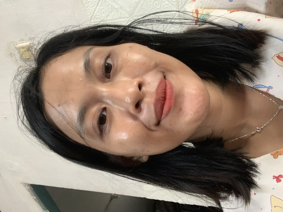 A young Asian woman with dark hair smiles softly at the camera. Her skin has a noticeable sheen, and she wears a coral-toned lipstick. A delicate silver necklace adorns her neck. The background is somewhat obscured, showing hints of a patterned fabric, possibly bedding, and a wall with peeling paint. The image has been rotated, with the woman's face appearing at an angle.