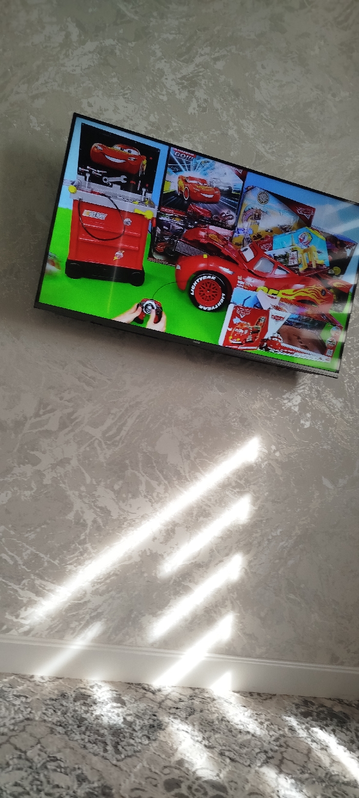 A flat-screen TV displays a vibrant image featuring a "Cars" toy theme