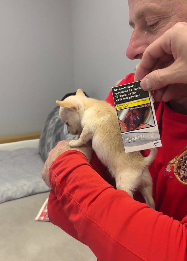 A middle-aged man in a red long-sleeved shirt holds a tiny light-colored Chihuahua in his arms, then places it down on a gray couch. The man holds a cigarette pack in front of the dog, showing the health warning label. The room has a gray wall and a gray couch with patterned pillows. A magazine is on the couch next to the dog. The man says "Shh" quietly in Bulgarian.