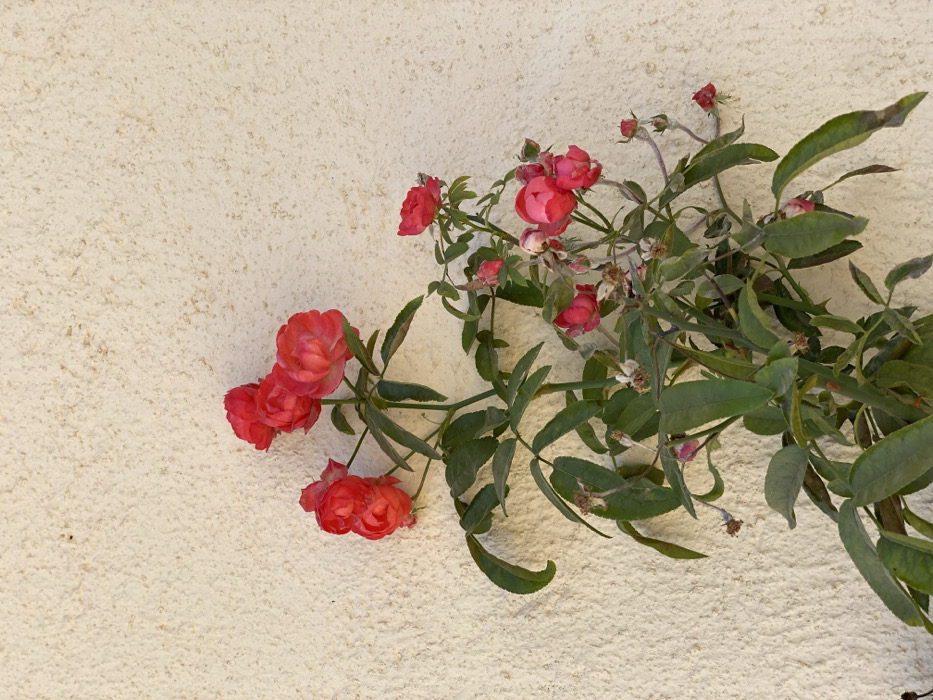 - "The image displays a climbing rose plant situated against a textured, light beige stucco wall, indicating a location on Rukuba Road, Nigeria" by FM-IZE0n2, licensed under CC BY 4.0