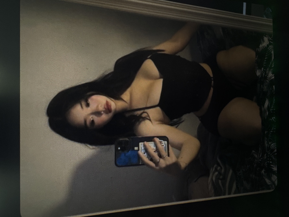 The scene is an indoor environment. A young female, appearing East Asian, is depicted from the waist up, kneeling or sitting on a patterned bedspread, reflected in a mirror. She wears a black halter-neck crop top that exposes her midriff, paired with black shorts. Her dark hair is long and styled down, falling over her shoulders. Her face features light makeup. Her left hand, visible in the reflection, holds a dark-colored smartphone, positioning it to capture the mirror selfie. The background visible behind her reflection consists of a plain, light-colored wall, with a distinct shadow cast on the left. The patterned bedspread features a dark leaf or floral motif. This indoor environment is described as being in the city of Oltiariq, Uzbekistan.