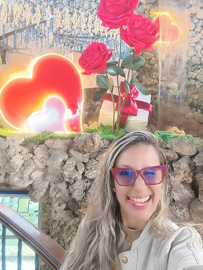 An adult female, with long wavy blonde hair and pink cat-eye sunglasses, is depicted from the chest up, smiling with an extended tongue while facing the camera. She wears a light-colored jacket over a tan top. The background presents a decorative display set against a light-colored stone wall partially covered with green artificial moss. The display features an illuminated red neon heart with a smaller white heart outline on the left, three oversized artificial red roses with green stems positioned above a white gift box adorned with a red ribbon and bow in the center, and an artificial waterfall feature with a partially visible orange neon heart outline on the right. A dark wooden handrail is visible in the lower left foreground. The scene is located in Carrizal, Venezuela.