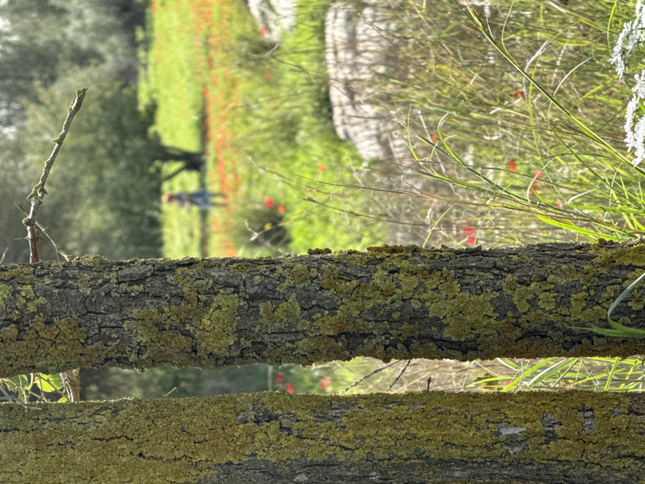 The image depicts a sunlit natural landscape within Modiin-Maccabim-Reut, Israel. In the foreground, two prominent tree trunks are visible, heavily encrusted with yellow-green lichen. The trunk on the left is broader than the one on the right, which stands slightly behind it. The midground reveals a lush green field interspersed with numerous vibrant red wildflowers, consistent with poppies, and patches of taller, dried grasses. On the right side of the midground, several large, smooth, light-colored rocks are present among the vegetation. In the blurred background, a single human figure, appearing to be a young child with reddish-brown hair, stands in the field amidst the red flowers. The child is dressed in a light blue garment. Further in the background, a large, out-of-focus green tree is visible under bright daylight conditions.
