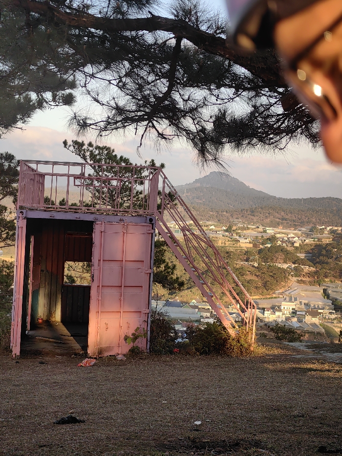 The image depicts an elevated outdoor scene in Lạc Dương, Vietnam, overlooking a residential valley. In the foreground, a two-story structure, seemingly constructed from a pink-painted shipping container, occupies the left side. The ground level of this structure features an open doorway revealing a dark interior. An external pink-painted metal staircase ascends from the ground on the right of the container to an open upper platform, which is also painted pink and features a skeletal railing. The immediate ground around the structure is dry, sparse earth with patches of light brown vegetation and minor debris. Beyond the structure and staircase, a sprawling town or settlement is visible across the undulating terrain. This area contains numerous buildings, many with light-colored or translucent roofs, suggesting residential and possibly agricultural greenhouse structures. In the distant background, a prominent, tree-covered mountain rises under a sky exhibiting soft blue and pink hues, indicative of either sunrise or sunset. The top edge of the frame is obscured by the dark, intricate branches and needles of a large conifer tree. No individuals are present in the frame. A blurred, out-of-focus element, possibly part of headgear or equipment, partially obstructs the upper right corner of the image.
