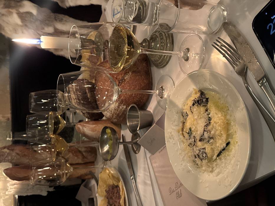 An overhead shot captures a lavish table setting featuring an elegant meal. A white plate laden with a creamy dish sprinkled with dark specks sits beside silverware and a partially visible mobile phone. Wine glasses, some filled with liquid, intermingle with bread and a lit candle. In the foreground, a small dish of food is also present. A menu card is subtly placed. The setting creates a sophisticated and intimate dining experience.