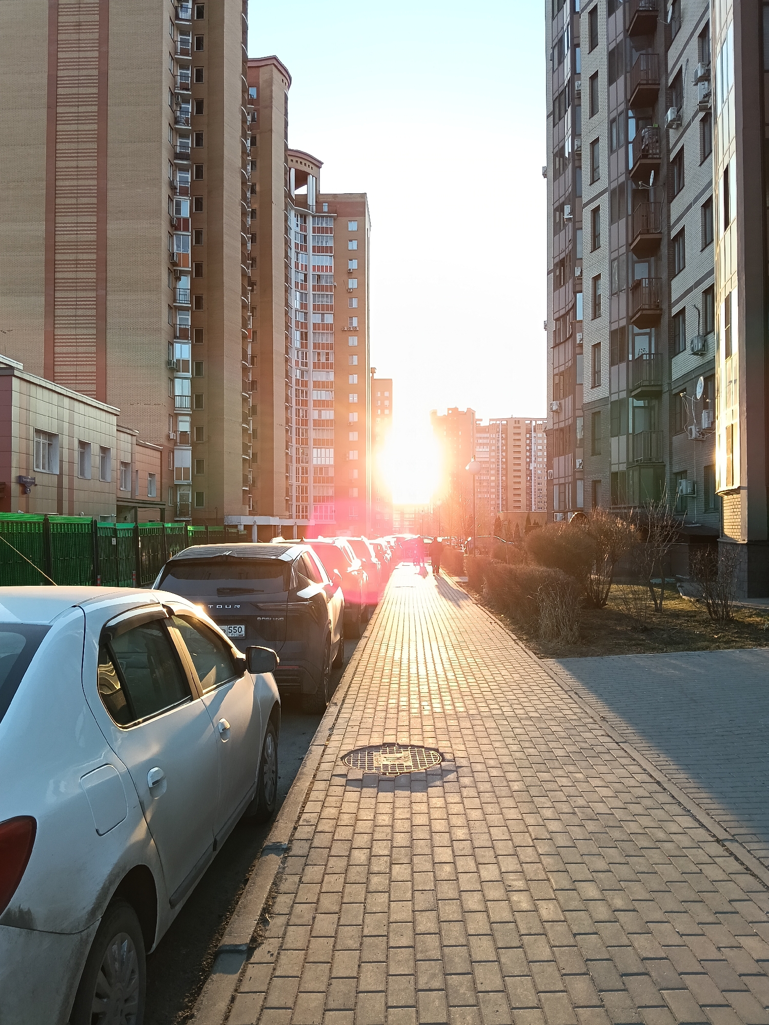 This image depicts an urban street scene in Odintsovo, Russia, at a low-sun angle, indicative of either sunrise or sunset, with a prominent sun flare originating from the distant center. In the immediate foreground on the left, a white sedan, appearing somewhat dirty, is parked parallel to the curb, facing away from the viewer. Directly behind it, a dark grey SUV identified as a 'TOUR DASHING' is parked, displaying a Russian license plate partially visible as '550 RUS'. A line of additional parked vehicles extends into the glare of the distant sun. A wide, grey paved sidewalk, featuring a rectangular brick pattern, occupies the right side of the frame, intensely illuminated by the direct sunlight. A circular metal manhole cover is visible on this sidewalk in the mid-left foreground. Tall, multi-story residential apartment buildings line both sides of the street. The buildings on the left exhibit a light brown brick facade with vertical reddish-brown textured banding. The buildings on the right feature a light grey brick exterior with darker brown accent panels and numerous balconies; several external air conditioning units are affixed to their walls. Between the sidewalk on the right and the adjacent buildings, sparse, dormant vegetation, consisting of bare bushes and small trees, is present. Several indistinct human figures are observable walking on the sunlit sidewalk in the far distance, partially obscured by the sun's brilliance.