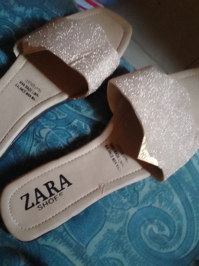 Two glittery, light gold Zara shoes are placed on a blue patterned surface. The left shoe is partially visible. "Zara Shoes" is printed in black on the inner sole near the heel. Text indicating "Leather Upper, Man Made Lining, Balance Man Made" is printed closer to the front strap, repeated in a smaller font on the right shoe. The shoes appear to be open-toed, flat sandals with a single wide strap over the foot.