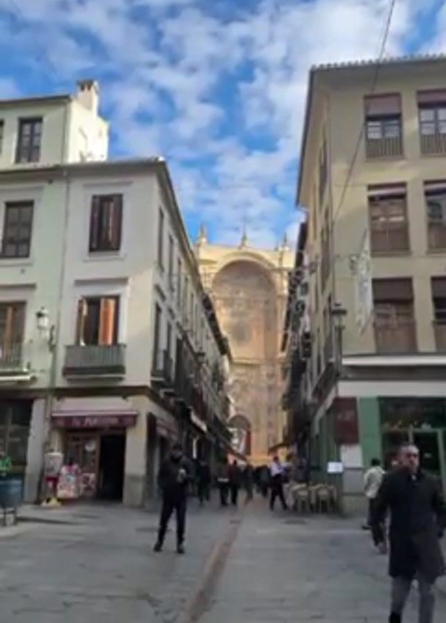 bustling pedestrian street leading toward a large, ornately detailed cathedral