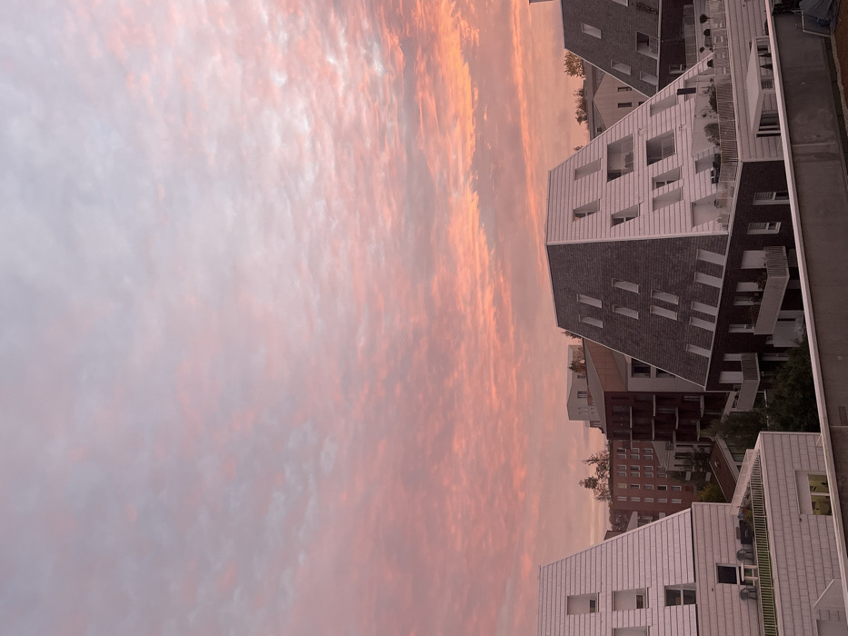 The image showcases a scenic view of buildings beneath a vibrant sunset. Modern architecture with white and brown facades stands out, their shapes and lines creating an urban landscape. The sky is filled with streaks of pink, orange, and purple, creating a warm and picturesque backdrop. The perspective appears to be from a high vantage point, providing a wide view of the city and the colorful sky.