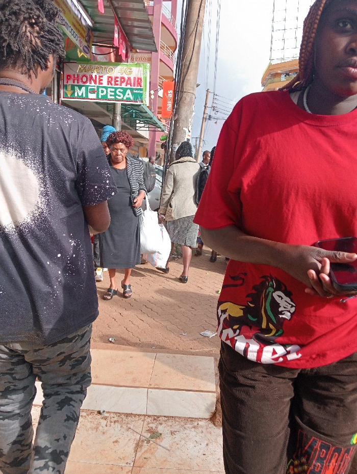 An urban street scene features several pedestrians. One woman with braided hair wears a red t-shirt with a lion graphic. A sign reading "MARTO 4G PHONE REPAIR" is visible over a store. Another woman in a striped jacket and black dress carries a white plastic bag. To the left, a person in a black t-shirt with camouflage pants faces away from the camera.