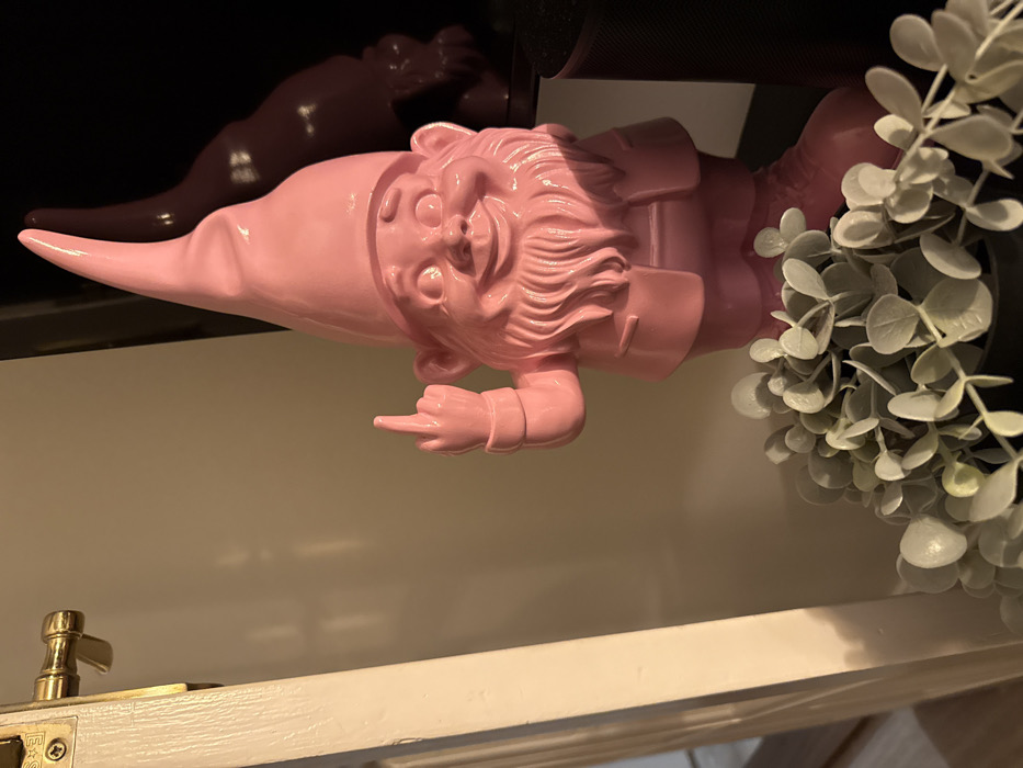 A pink garden gnome with a pointy hat gives the middle finger