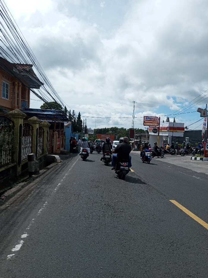 The image displays a street scene in the city of Taohom, Laos, under a partially cloudy sky. A dark gray asphalt road, marked with a solid yellow line on the right and faint broken white lines on the far left, occupies the foreground and midground. On the left, a light orange multi-story building with a tiled roof, white window frames, and decorative dark fencing behind stone pillars is visible. Numerous black utility cables are strung across the upper left portion of the frame. Further down the street on the right, an "Alfamart" convenience store is clearly visible with its red and white signage, adjacent to a paved area with black and white striped curbs. A tall, thin metal communication tower rises behind the Alfamart. Approximately 10-15 individuals are operating motorcycles on the road, moving away from the viewer. Riders wear various clothing and helmets. One prominent motorcyclist in the foreground wears a dark jacket and blue pants on a dark scooter. A white car is partially visible among the motorcycles further down the road, and several motorcycles are parked or maneuvering near the Alfamart.