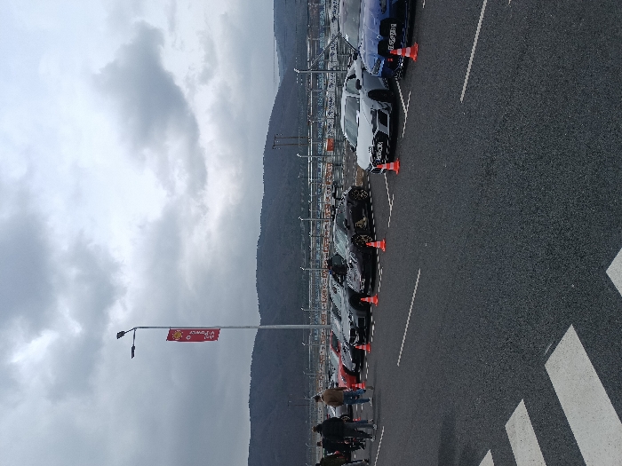 The image depicts an outdoor automotive event or parking area, situated in Dospey, Bulgaria, under a heavily overcast sky