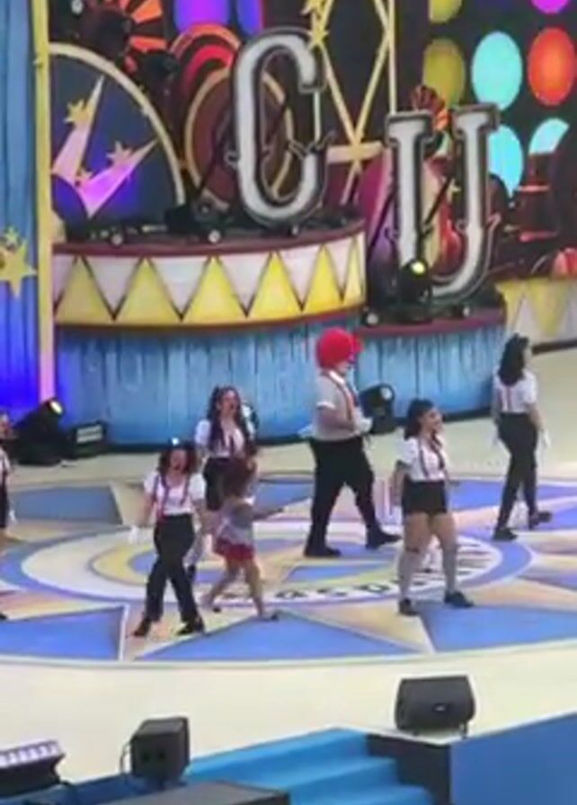 A group of performers are on stage in a show. The stage is brightly colored with a large "CJ" sign behind them, and there are blue bleacher-style seats in the foreground. The performers are wearing matching outfits, except for one who is dressed as a clown. They are dancing in unison to upbeat music, moving in a coordinated fashion. The scene is energetic and colorful.