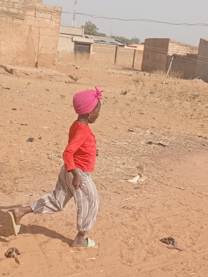 A child wearing a pink headscarf, red shirt, and striped pants is walking or running on a sandy, dirt-covered ground