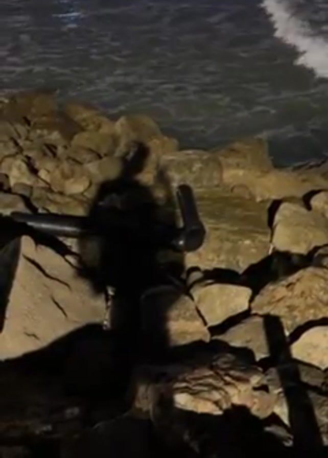 dark scene at a rocky shore, likely at night. Waves break on the coastline in the background, with some light reflecting off the water, possibly from a distant source. In the foreground, a person's shadow is cast on the rocks and a section of black piping. The piping is fixed to the rocks and appears to be a T-joint configuration. There is no discernible interaction between the person and the pipe, and the overall scene suggests a quiet, somewhat isolated location with the sound of the ocean.