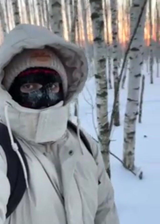 A person wearing a white winter coat with a hood, a red-and-white knit hat, and a black face mask with frozen snow on it, stands in a snowy birch forest next to a snowmobile