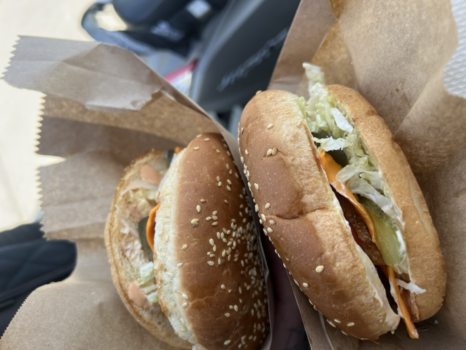 Two long sandwiches are depicted, packaged for consumption within a vehicle interior in Rustavi, Georgia