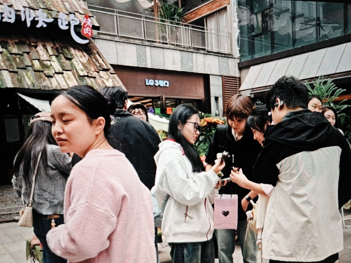 The image presents an urban street scene in the Chongqing High-tech Zone, China, featuring multiple individuals and commercial architecture during daylight. In the immediate foreground, a young East Asian female with dark hair pulled back and wearing a light pink, long-sleeved sweater is seen in a three-quarter profile, looking towards her right and slightly downwards. To her right, a group of five East Asian individuals is engaged in an interaction. A female with dark hair and glasses, wearing a white hoodie with a red zipper and jeans, holds a small, dark, spherical object in her left hand, presenting it to the group. Next to her, a male with medium brown hair, wearing a dark top, looks down at the object. Beside him, a female with dark hair, wearing a light-colored top, smiles while holding a small pink bag adorned with a black heart and "LOVE" text. A male, with his back partially to the viewer, wears a black and white color-blocked hooded jacket and an earbud in his right ear, observing the interaction. Two additional females are partially visible behind this male, also looking towards the central interaction. The background features several buildings. To the left, a structure with a brown tiled roof displays a white sign with Chinese characters reading "肉串快烤" (Quick-grilled Meat Skewers) and a red meat skewer symbol. Centrally, a modern building shows "LEJAN" on a sign and "LG入口" (LG Entrance) on a brown façade. To the far right, a contemporary building with glass and concrete elements is visible. Green foliage is interspersed between the buildings. The ground is paved.