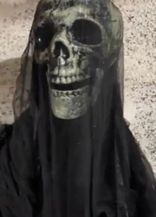 A close-up shot shows a static Halloween decoration resembling a grim reaper
