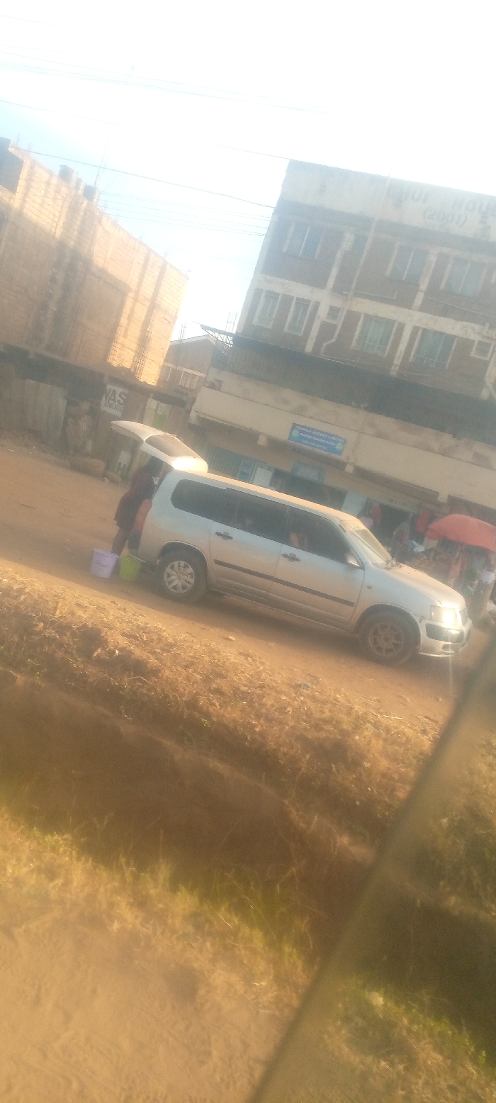 A silver Toyota Probox station wagon parks on a dirt road with its rear door open. A person stands near the open door, possibly loading or unloading items. Several buckets are on the ground nearby. The scene is set in an urban or semi-urban area, with buildings visible in the background. Other people are standing on the street. The photo's lower portion shows grassy areas alongside the road.