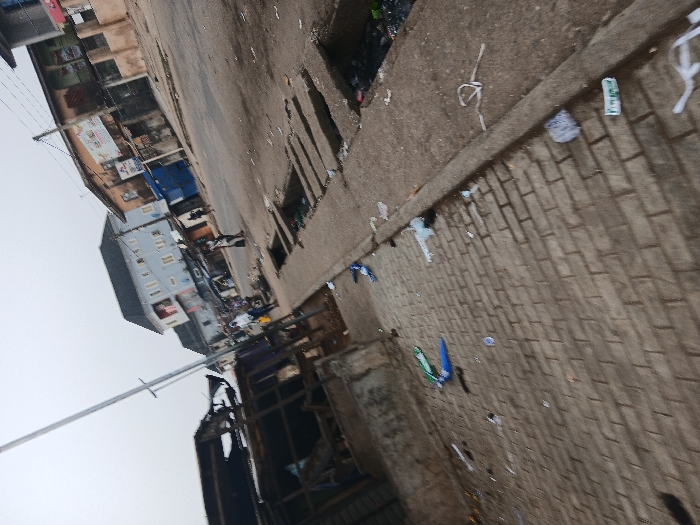 An urban street scene is captured at an angle. Buildings line the left, while a curb and brick sidewalk appear on the right, littered with trash. The road stretches into the distance with cars and pedestrians visible. Overhead wires cross the sky. The sky itself is overcast. A metal structure with a damaged or incomplete roof is in the foreground. The image orientation is unusual, making the buildings appear to lean.