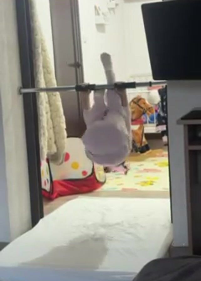 young child hanging upside down from a doorway pull-up bar. The child is wearing a light pink pajama set and their hair is pulled back. A white mattress is positioned directly under the pull-up bar, presumably for safety. In the background, visible through the doorway, is a child's room with toys, including a rocking horse. A television is visible on the right side of the frame. The overall environment appears to be a home interior.