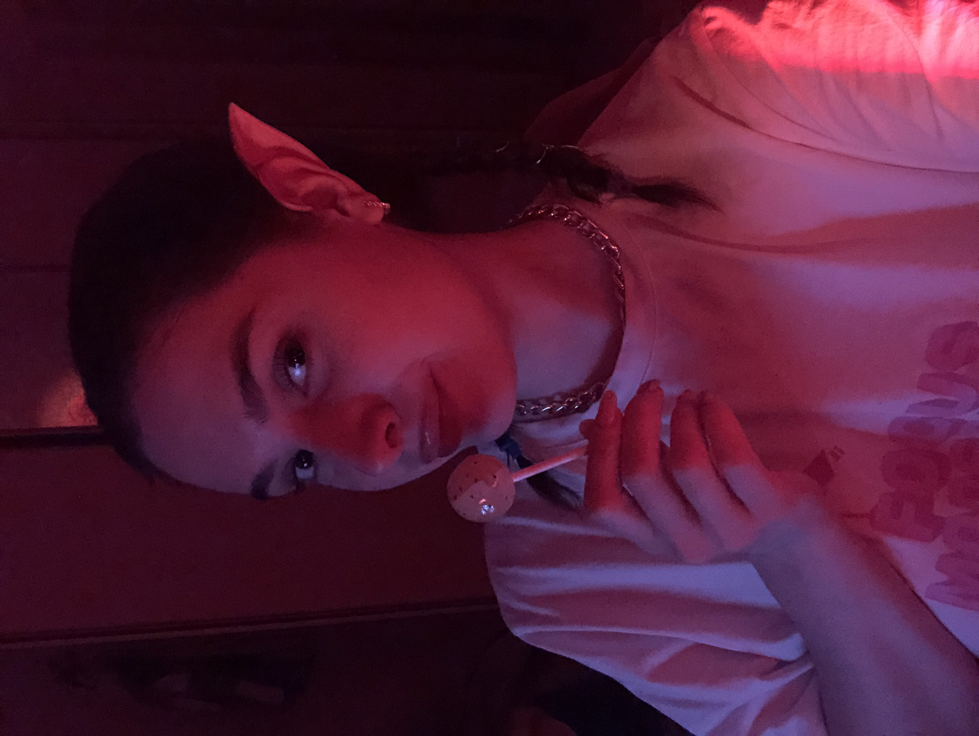A person with elf ears and braided hair holds a lollipop. They wear a chain necklace and a t-shirt with a floral pattern on one shoulder. The scene is lit with a strong red light, giving a red hue to the skin and clothing. The person is looking towards the camera with a slight smile. The background is dark and indistinct.