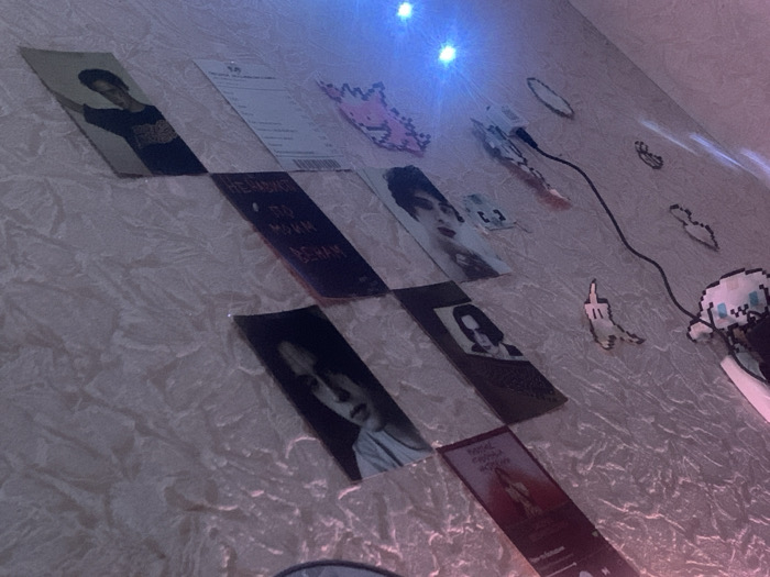 The image displays a section of a textured, light-colored wallpapered wall illuminated by blue and reddish-pink ambient lighting. Various items are affixed to the wall in a diagonal arrangement. From the upper left, a vertical print shows a young individual in a dark t-shirt with a yellow graphic. Below it, a dark vertical print contains white Cyrillic text, partially legible as "НЕ ЗНАЕТ ЭТО МОЯ ВЕЧНАЯ" (Does not know this is my eternal). To the right of these, a white document with unreadable text is present. Further right and below, a vertical print depicts a person's face with dark hair and red lips. Beneath this, another dark vertical print features a person with long dark hair and sunglasses. At the bottom right, a vertical print resembles music album art or a player interface, displaying the Cyrillic text "МОЯ СЕРДЦА АВТОМАТ" (My heart's automat). Pixel art decorations are scattered across the wall: a pink figure in the upper-left, small oval and ring shapes, a white hand forming a middle finger gesture, and a white, blue-eyed character resembling a ghost. A white USB charger block is affixed, with a black cable extending from it downwards and to the right, traversing some of the pixel art. The specific location within the city of Donetsk, Ukraine, is not identifiable from the visual content of the image.