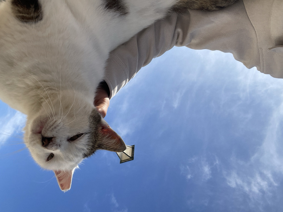 - "The image, captured from a low angle, depicts a close-up interaction between a person and a cat against a bright blue sky in the city of Corfu, Greece" by FM-T5EOT2, licensed under CC BY 4.0
