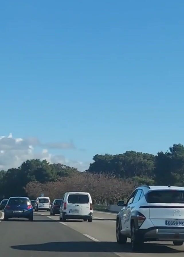 view from inside a vehicle on a highway during daytime. Several cars and vans are visible in the lane ahead, moving at a moderate speed. The sky is bright blue with scattered clouds. Trees and other greenery can be seen along the side of the highway. The road surface is asphalt.