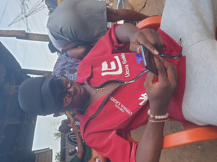The image depicts an outdoor urban scene in Onitsha, Nigeria. In the foreground, a dark-skinned individual is seated in an orange plastic chair, engrossed with a black smartphone held in both hands. The individual wears a black baseball cap reversed, red reflective sunglasses, a partially unzipped red collared shirt with "CORONA CORONA LIGHTS" and "Lkcuv Golds" text, a gold cross pendant on a thin chain, and light grey trousers. A thin gold bracelet and a pink beaded bracelet are visible on the left wrist. The setting is beneath a rudimentary overhead structure supported by wooden posts, with the ground composed of exposed dirt. In the mid-ground, several other individuals are present. To the right of the main subject, a person in a patterned blue and white shirt is partially visible. Further right and behind, another person, dressed in a white top and a grey skirt or dress, is bent over near a metal basin on the ground. In the distant background, a large metal electricity transmission tower is prominent against a bright, hazy sky, with indistinct urban structures also visible.