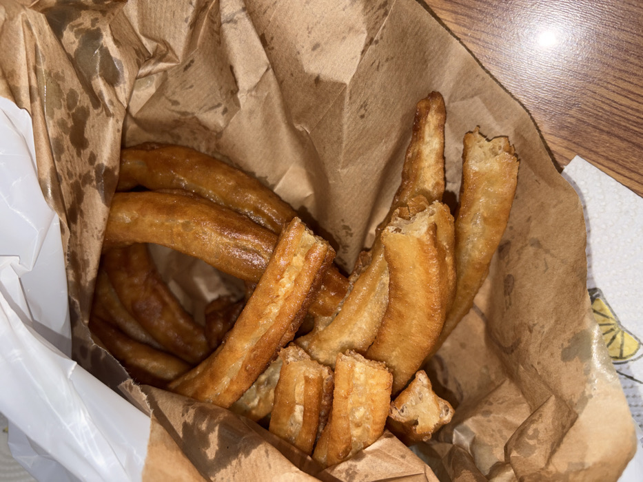 - "A close-up view shows multiple pieces of golden-brown churros contained within a crinkled, oil-stained brown paper bag, which is partially open" by FM-Y5o3W2, licensed under CC BY 4.0