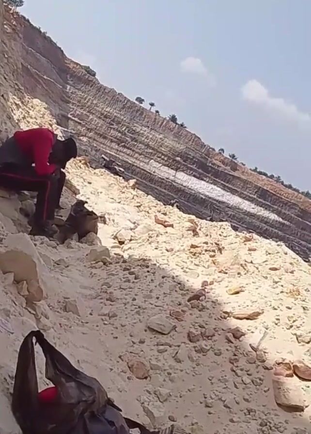 A person in a red shirt and black pants is kneeling on a slope, seemingly examining or interacting with something in front of them. The slope is covered in light-colored rocks and sand. A black bag lies in the foreground. In the background, there's a layered rock formation, possibly a cliff or quarry face, with alternating bands of color. A few trees are visible on top of the formation, and the sky is light blue with some clouds.