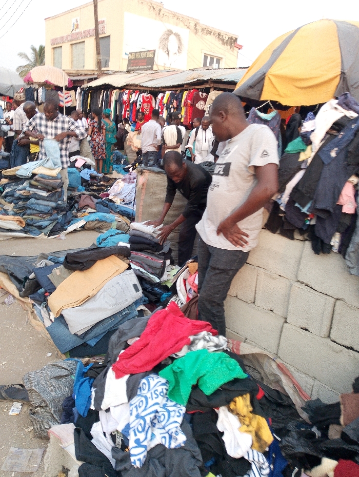 A bustling outdoor market scene with people browsing through piles and racks of clothing. A man in a gray shirt stands near a heap of colorful garments, while another person sorts through stacked jeans. A building with a large advertisement overlooks the market, and overhead, a striped awning provides shade. There are clothes hanging on racks in the background. The ground appears cluttered with discarded items and debris.