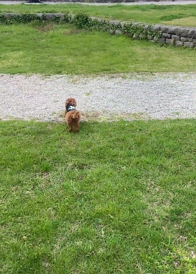 A small dog wearing a dark-colored vest runs across a grassy area toward the water. In the distance, three people sit on a wall facing the sea. There is a gravel path in the foreground. The sky is cloudy, with patches of blue sky visible. The sea is calm. The dog runs to the grass and then moves out of the scene.