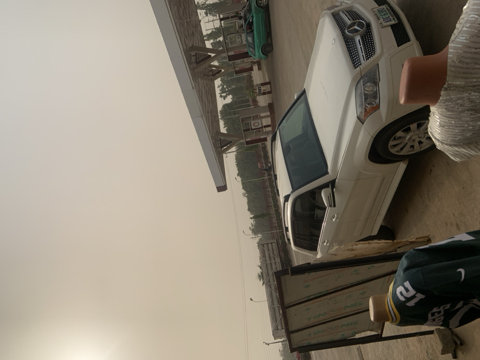 The image portrays an outdoor scene at a gas station located in Immigration Quarters, Nigeria, under a hazy, light brown sky with a distinct sun flare in the upper left. A white Mercedes-Benz GLK SUV, bearing license plate "ABC-638UN," is parked on a paved surface in the mid-ground, facing slightly right. In the background, a white and red-trimmed gas station canopy covers multiple fuel dispensers. A green SUV is visible parked further under the canopy. The foreground features two torso mannequins; the left mannequin is dressed in a green jersey displaying "ROGERS 12," while the right mannequin wears a light-colored, sequined top. A large, framed display board with rectangular panels stands to the left of the Mercedes-Benz. Distant background elements include a road, utility poles, and green vegetation. No identifiable individuals are visible engaging in actions.